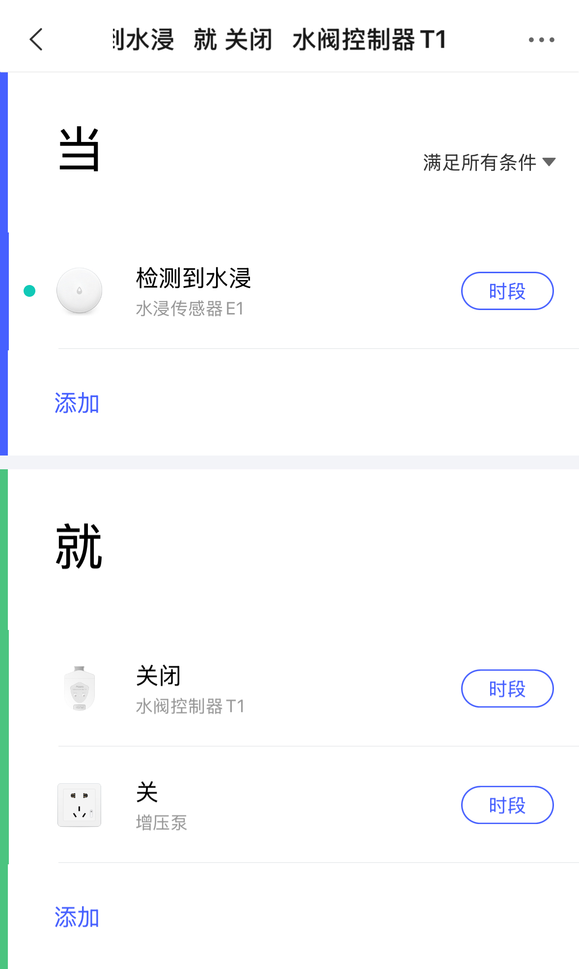 剩下的就是做自动化,我就做了一条。是和水浸传感器联动,发现浸水就关闭增压泵电源,关闭水阀门。为什么要联动关增压泵,因为一旦漏水管道就处于失压模式,那增压泵会一直启动,增加漏水的速度。