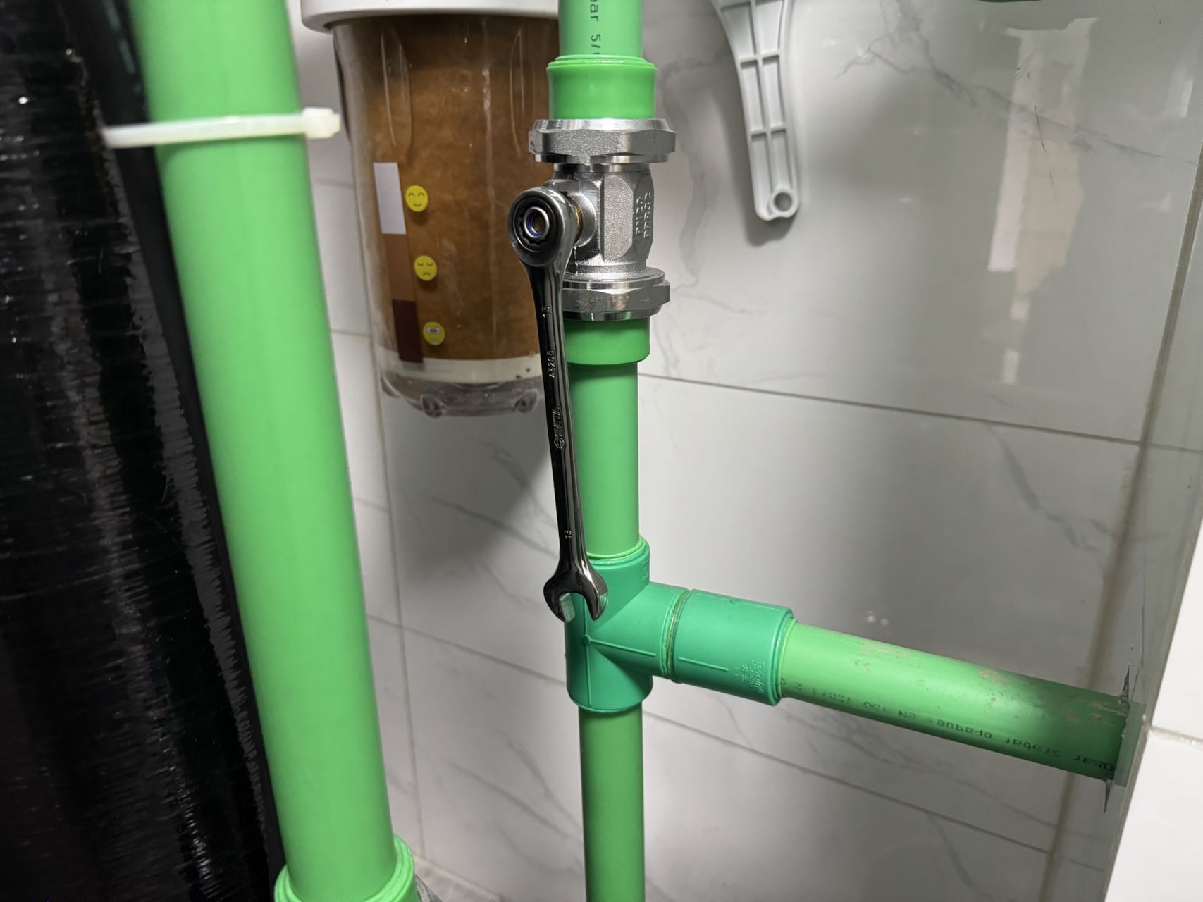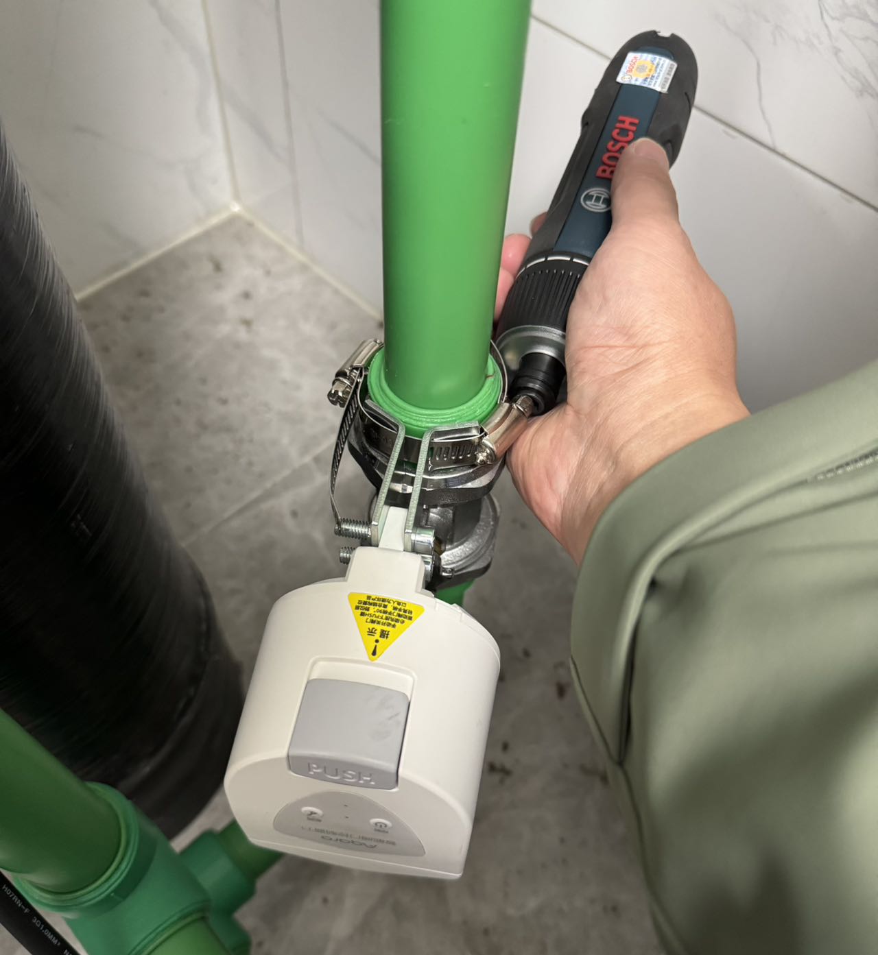 安装发现不能用夹板,只能用不锈钢卡箍,但是还发现,这卡箍短了点,套不住啊,还好还好,上一个天然气阀门没用上的卡箍,这不用上了么,两卡箍串联起来。还得是脑子转的快。自带的内六角扳手不是太好用力,反正差生文具多,工具有的是,博世go3拿出来,完成安装,测试通过。