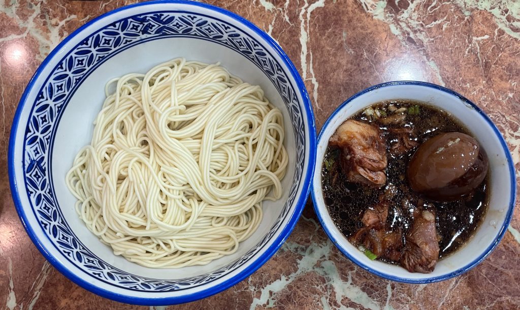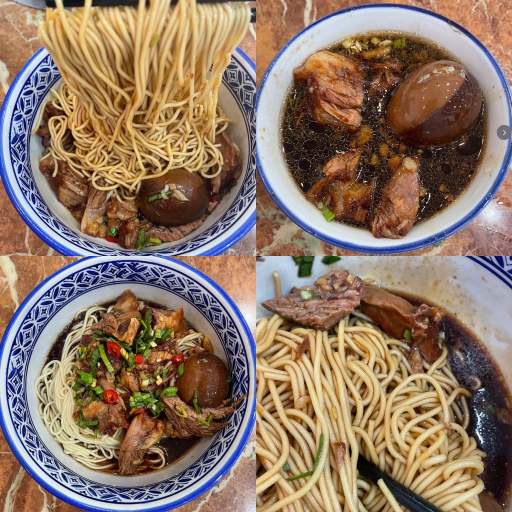面浇头是单独放的,也就是苏州人说的“过桥”。桌上不锈钢小碗里,铺上切好的本地大蒜叶(苏州人吃面要放本地大蒜叶,用本地大蒜瓣插种,自己培育的,叶细长,蒜味浓。外面来的统一称洋大蒜)、小米椒,放入拆好的羊肉,并浇上汤,一碗羊肉面的浇头就准备好了。不同价格不同份量,可以加上羊骨头、羊腱子等,丰俭由人。面是厨房里现下的控干水份的拌面,清清爽爽摆在青边碗里端来,配上一碗红烧羊肉浇头放在边上,一白一红,忍不住口水四溢。我还加了个卤蛋,主要是湾湾说我们吃不起,这不,吃上卤蛋了,还是一整个😄。