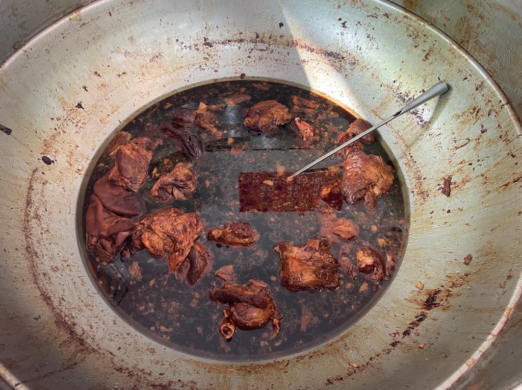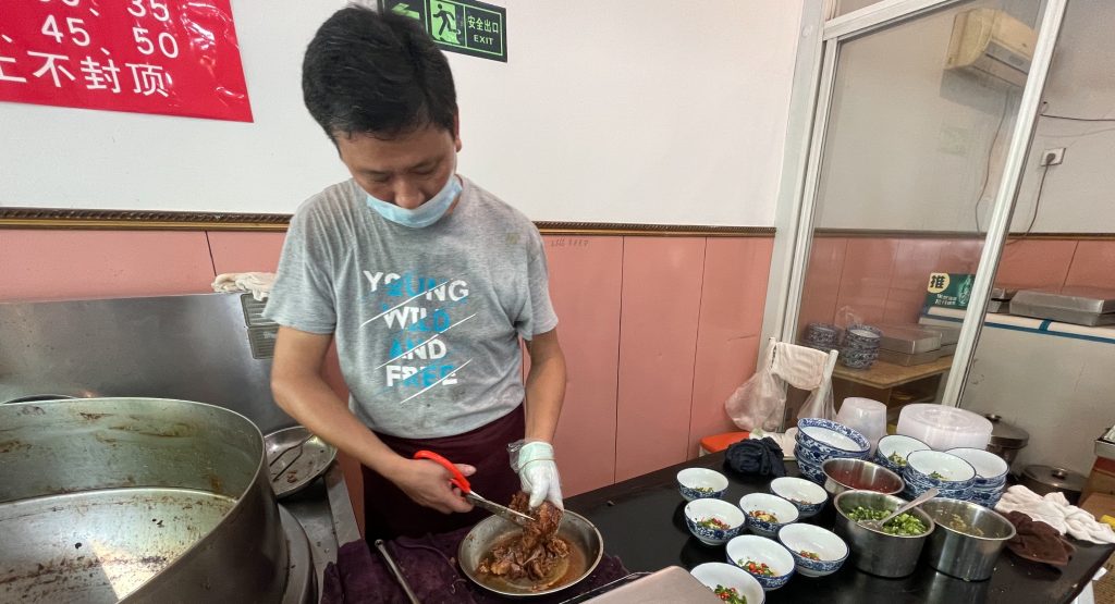 门口支着一口大锅,老板就站在门口,就着大锅里的红烧羊肉,用剪刀在拆肉摆面浇头。