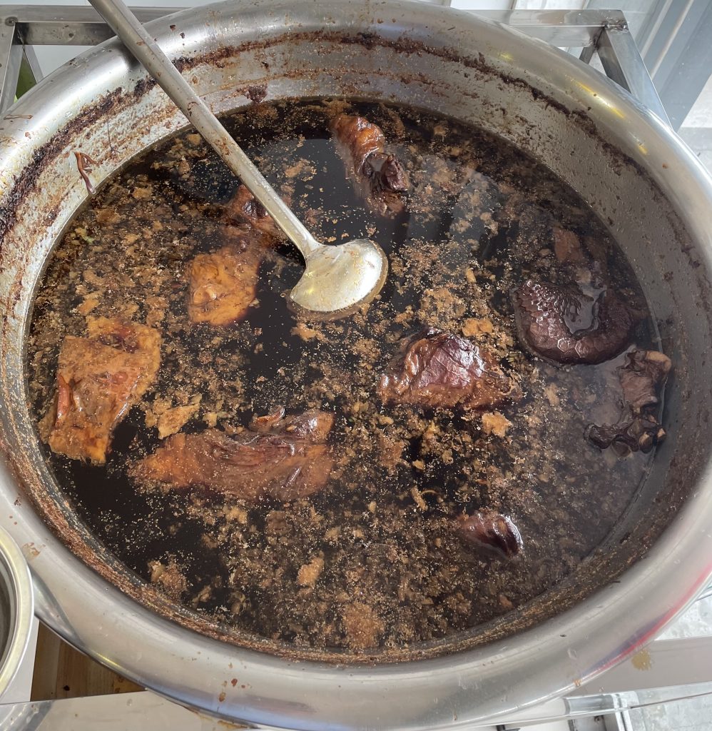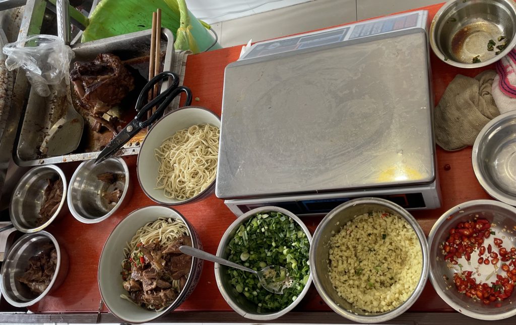 面馆只有一件门面,门口照例也是一口大锅闷着红烧羊肉,锅上漂着厚厚的一层羊油,汤汁油亮,散发着香味。老板照例是在拆羊肉和放浇头的碗。