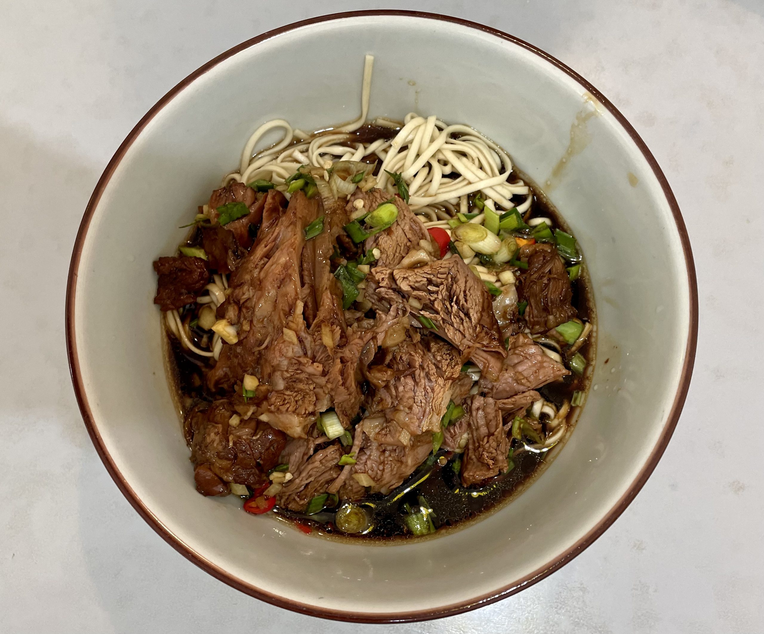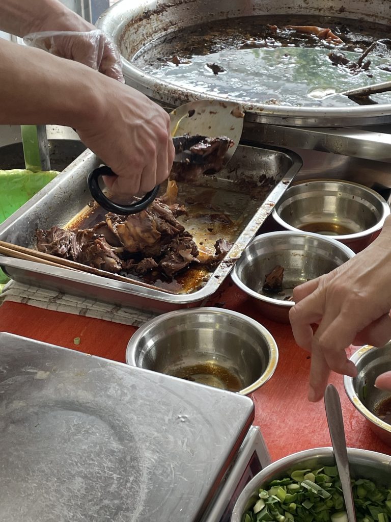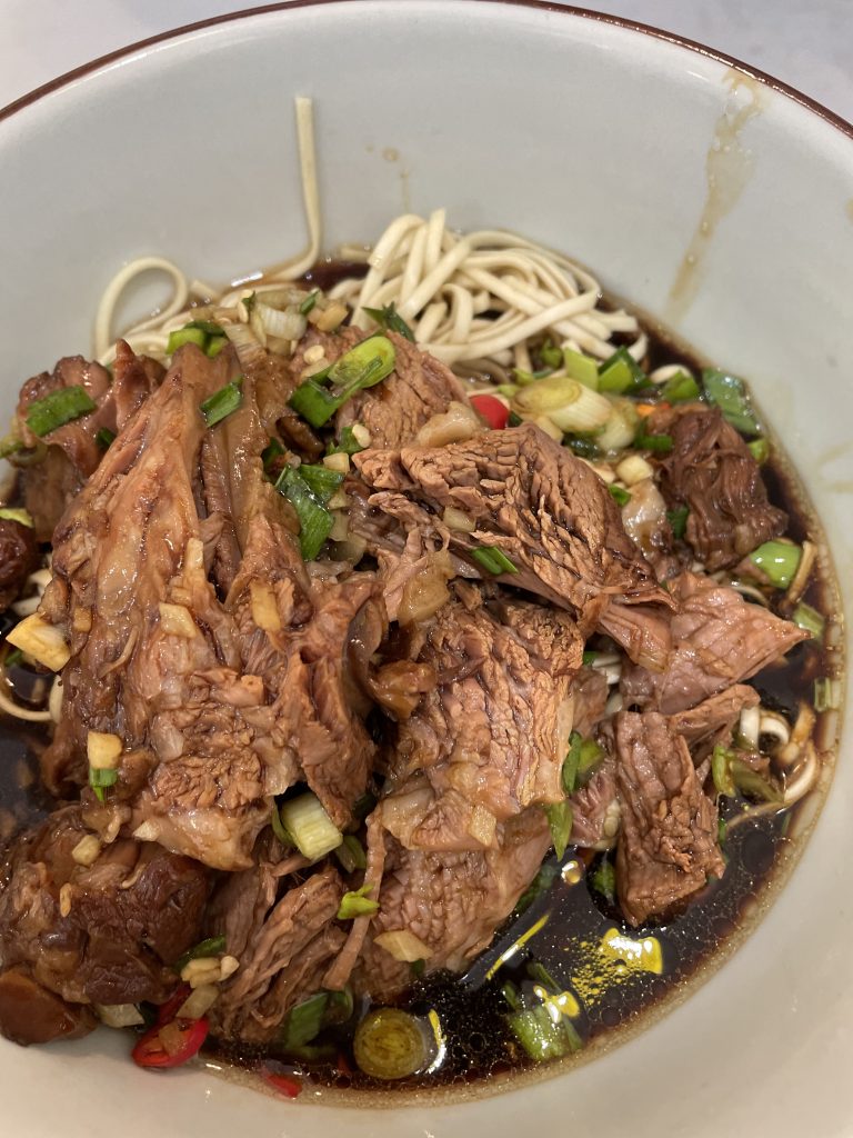 照例是羊肉面,想加个羊脚的,但是早已售罄。看来,想吃好的还得趁早。面端上来的时候,已经把羊肉浇头倒在了碗里,面是类似成品卷面的那种便面,这种面韧性相对比细面好点,多些嚼劲。把面拌匀,吃上一口,面劲道,口感不错,羊肉酥烂、入味,总体口味偏咸、味道还可以。