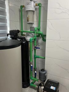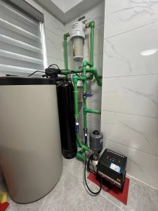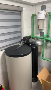 右侧是总的进水,然后分两路进两个前置过滤,出来合一路,然后留了一路水单独供厨房一个龙头,不进软水机,软水机出来的水供全屋,包括台盆、马桶、洗澡、地暖、洗衣房等。