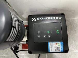 下图是水泵开机状态下的面板。上面的WIFI标记不是连家里的网的,而是有个诊断仪器,或者说是监控设备通过这个wifi链接水泵,可以监控水泵的压力、变频器工况等,也可以通过仪器进行调节。但家用也没必要去买这个设备。通电状态下,开关按键是红色的,开机后压力调节、电机灯显示绿色。