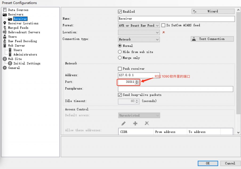 3. 此时点击 Test Connection 按钮,应该会弹出 Connection can be made 的提 示,如果不正常请检查防⽕墙设 置、软件配置等信息⽆误,并尝试重启 RTL1090 和 Virtual Radar。若⼀切正常建⽴,RTL1090 软件中右下的 TCP 图标应该会亮 起。