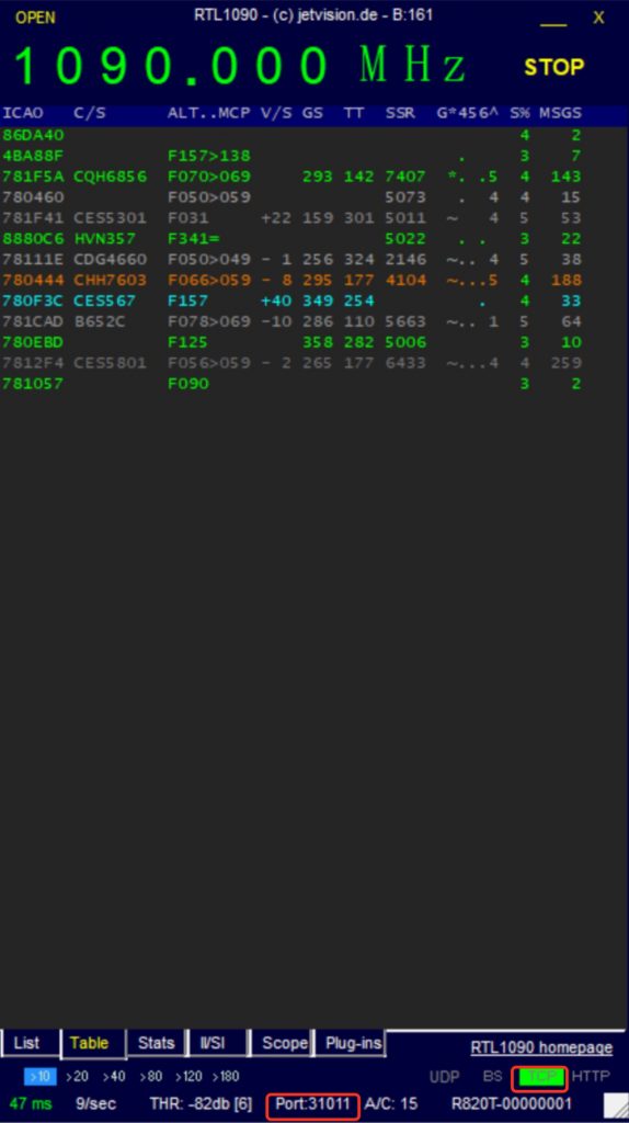 5. 双击运⾏ rtl1090.exe ,点击 START 按钮若出现防⽕墙提示,请允许。这样便 完成了 RTL1090 的配置。此 时正常应能收到上空经过⻜机的信号了,相关信息 可以在 Table 选项卡中看到。