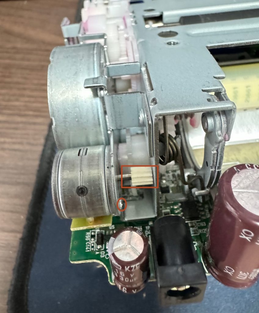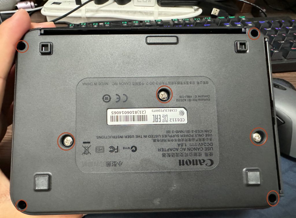 万事俱备,就开拆了。首先是把打印机的墨盒、相机纸盒、相机纸盒挡板都取下来,挡板取下比较简单,把塑料挡把弯一下,卡榫脱开就行。然后翻转打印机,拆下7颗螺丝。