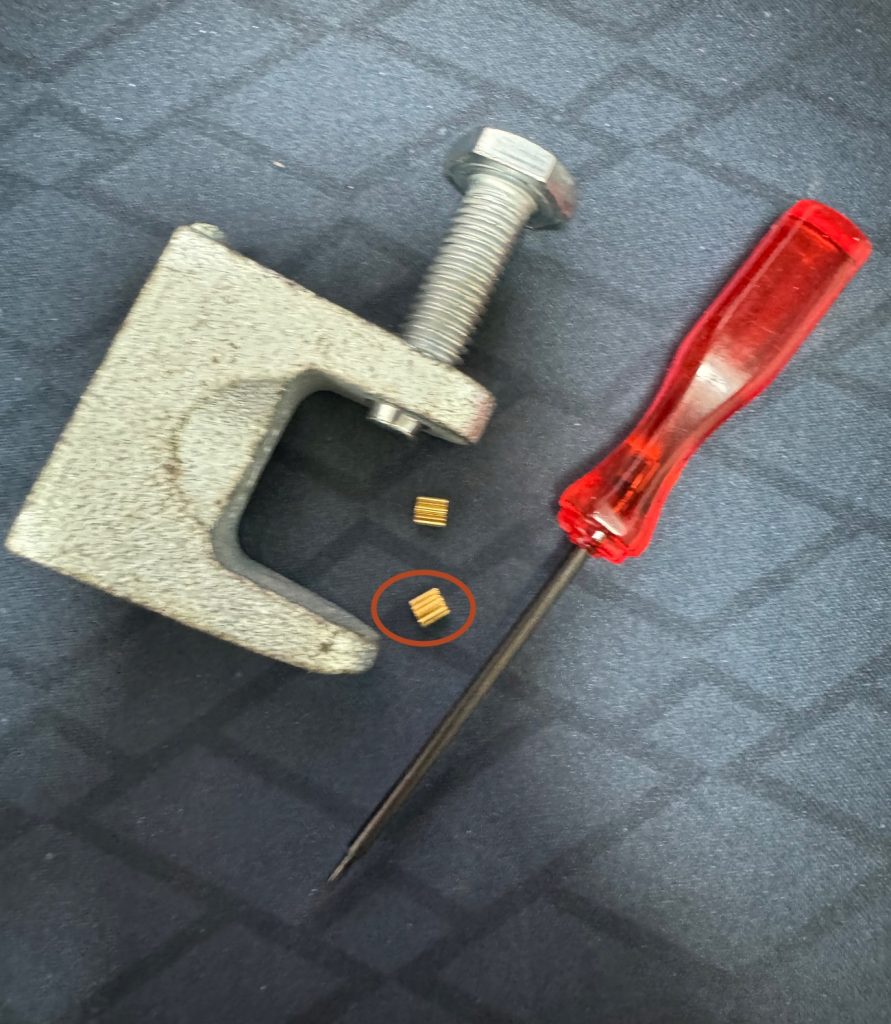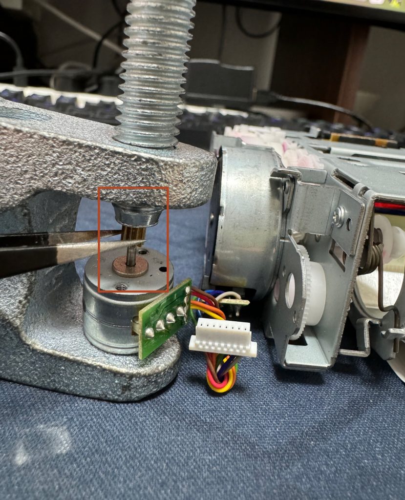 然后用这个套装工具,把替换的铜齿轮压到轴上,注意要慢慢均衡用力,别把轴压歪了。