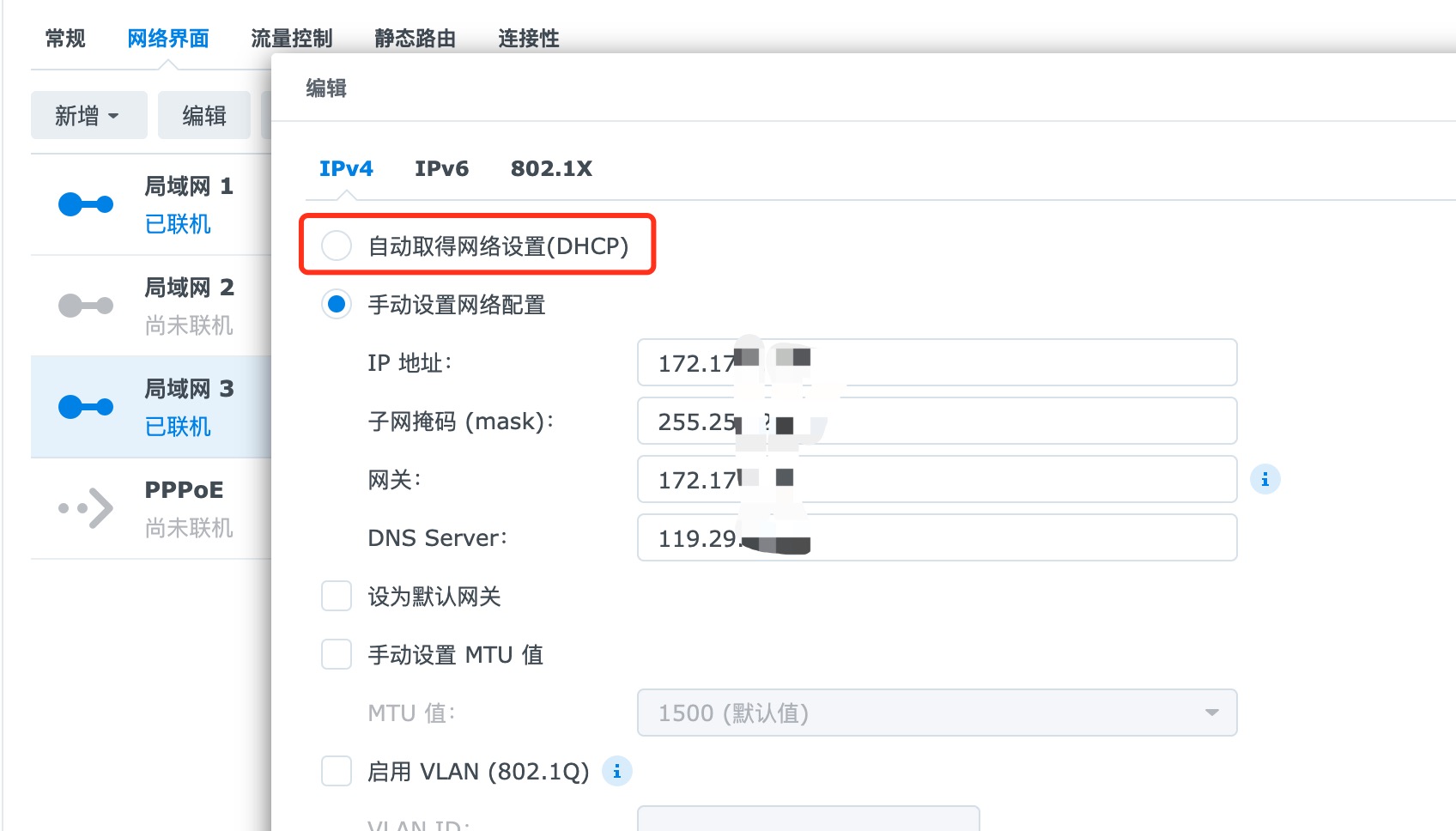 3、进行编辑,地址上选择DHCP,然后保存,再选择手动设置网络,按原来的IP地址等设置一下,然后保存,这时候,网卡正常了。