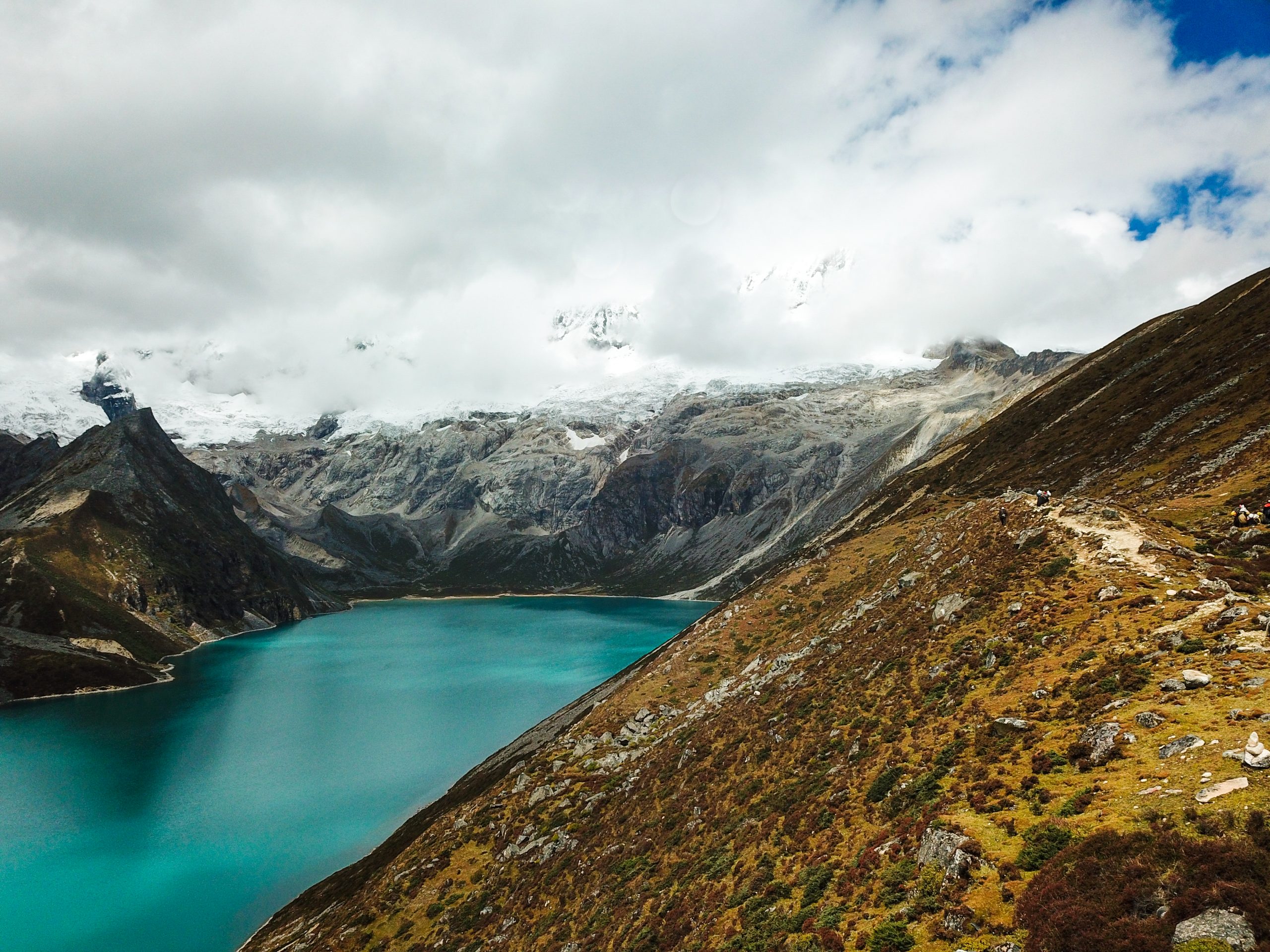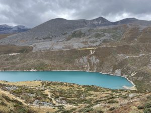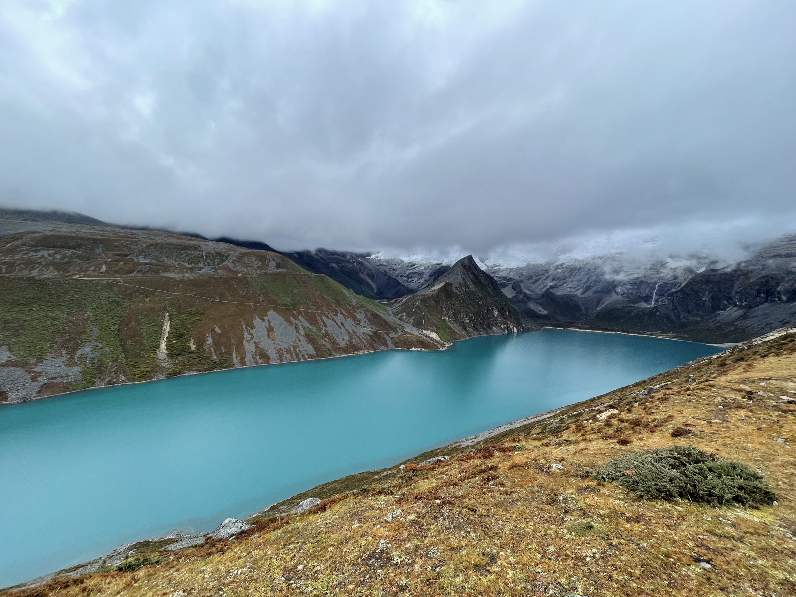 一路上风比较大,太阳也比较晒,高原上徒步,和我们在平原上完全是两个概念,走不快,负重也不能多,否则喘的很厉害。沿着湖在山腰上行走,由于经常有人去朝拜,因此修了一条简易的景区道路,也不是很好走,基本上就是羊肠小道加个栏杆。同行的一个小伙伴,走了三分之二的行程,脸色煞白、几乎是挪着在走,这时候,判断他是高反加低血糖,但是我们没有备高渗葡萄糖,只有食物,我不能贸然的让他吃东西,建议小口的吃点带去的含有葡萄干和坚果的面包,不能多吃,因为吃多了,血液都到胃里消化食物,会让缺氧症状加重。已经是下坡路段了,我们只能鼓励他继续走,除非是立马返回,但马上又是爬坡,他这个体能,让我比较担忧。