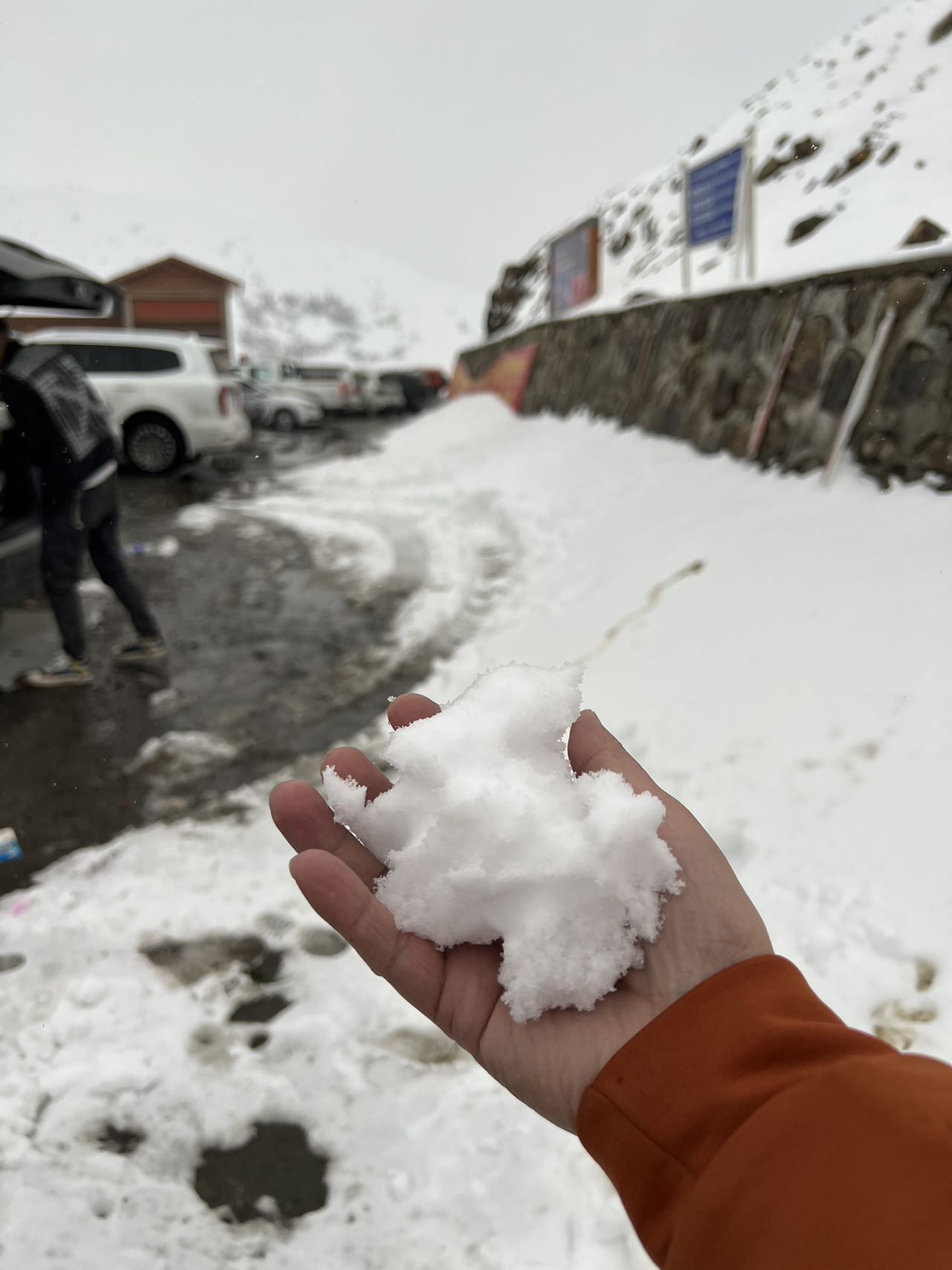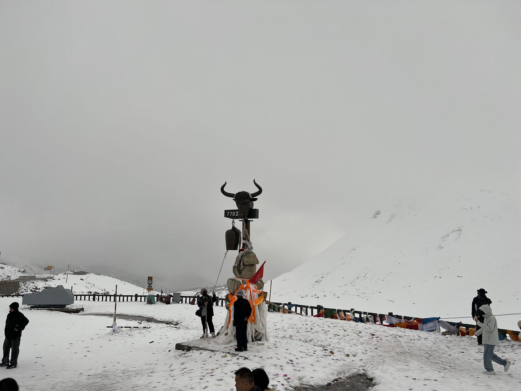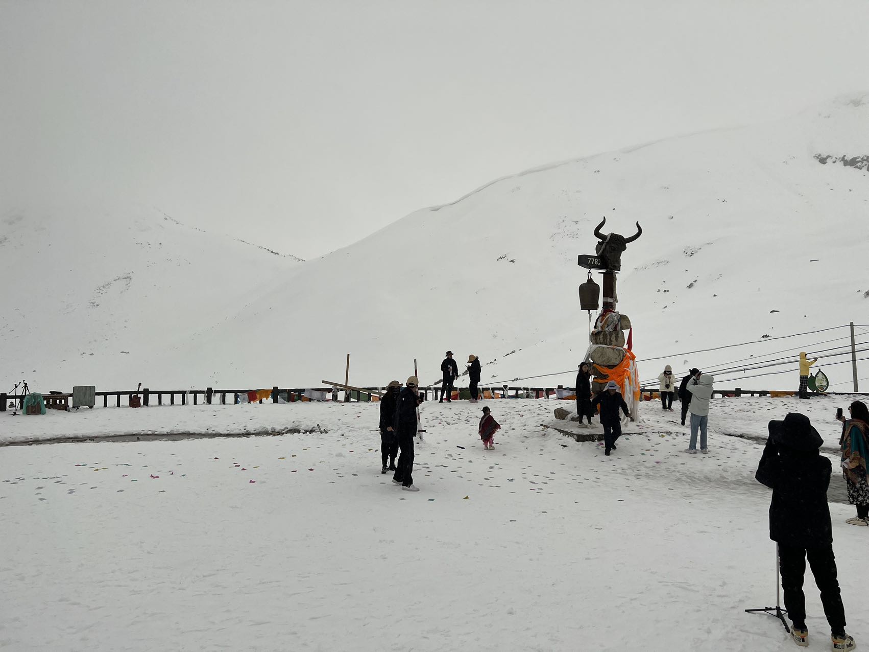 吃过午饭,下午就开始翻越色季拉山口,海拔4700米。一路上云雾缭绕、伴随着雨夹雪,经过几个发卡弯,一路爬升,很快就到达了色季拉山垭口观景台,边上停车观景的不少,只是外面飘着雪花,白雪皑皑,白茫茫的一片,南迦巴瓦和加拉白磊山全在隐在云雾中,无法看见。就在山口拍照打卡了一下,冷的受不了,很快就开走了。