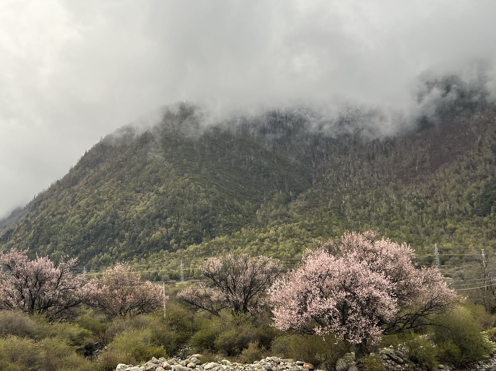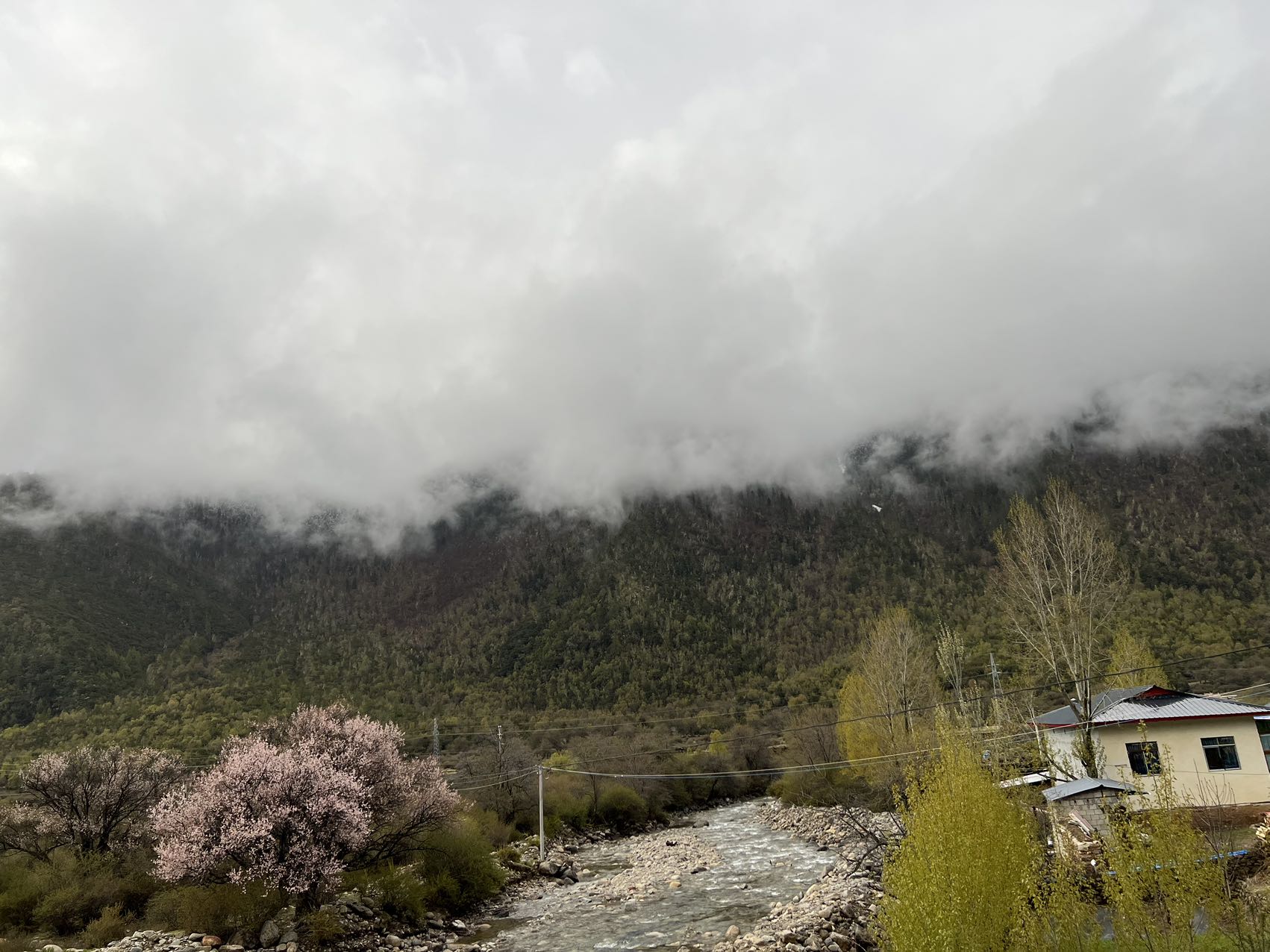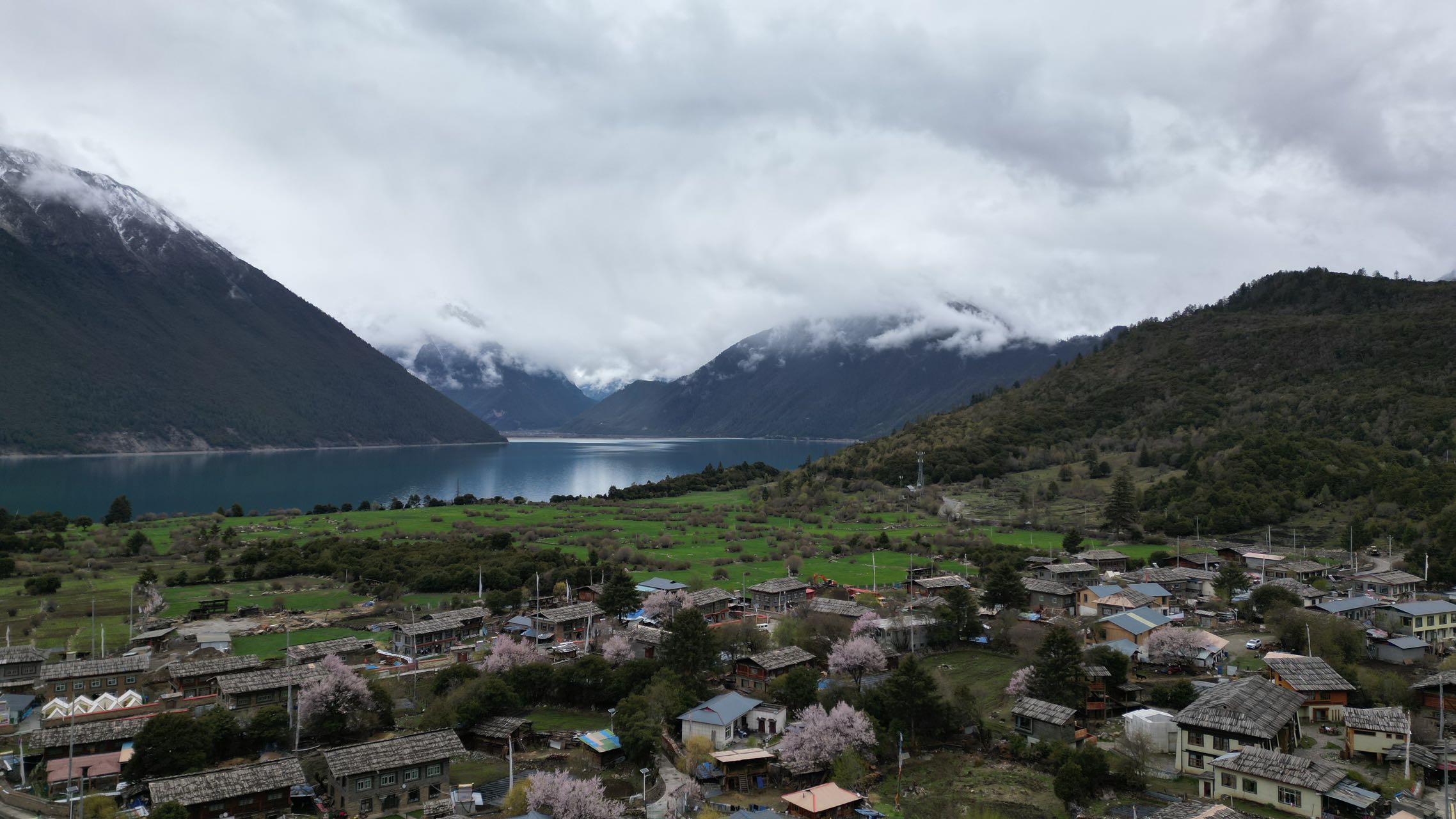 在这条开往巴松措的乡道上,我们领略到了塞外江南的风景,沿途星星点点的散落着盛开的桃花,点缀在大片的绿野里,加上云雾缭绕,真有点绿野仙踪的味道,偶尔经过的村庄,桃花掩映在里边,很是好看。经过一片桃花林,层层落落的桃花煞是好看,忍不住在细雨中飞了无人机航拍。