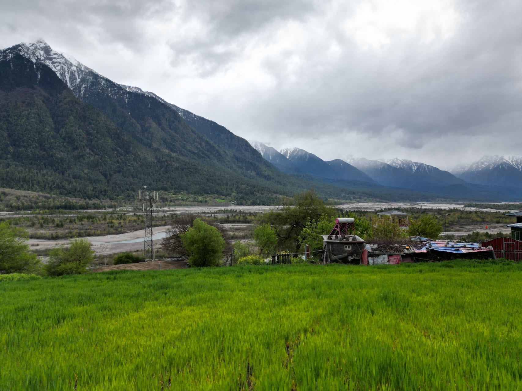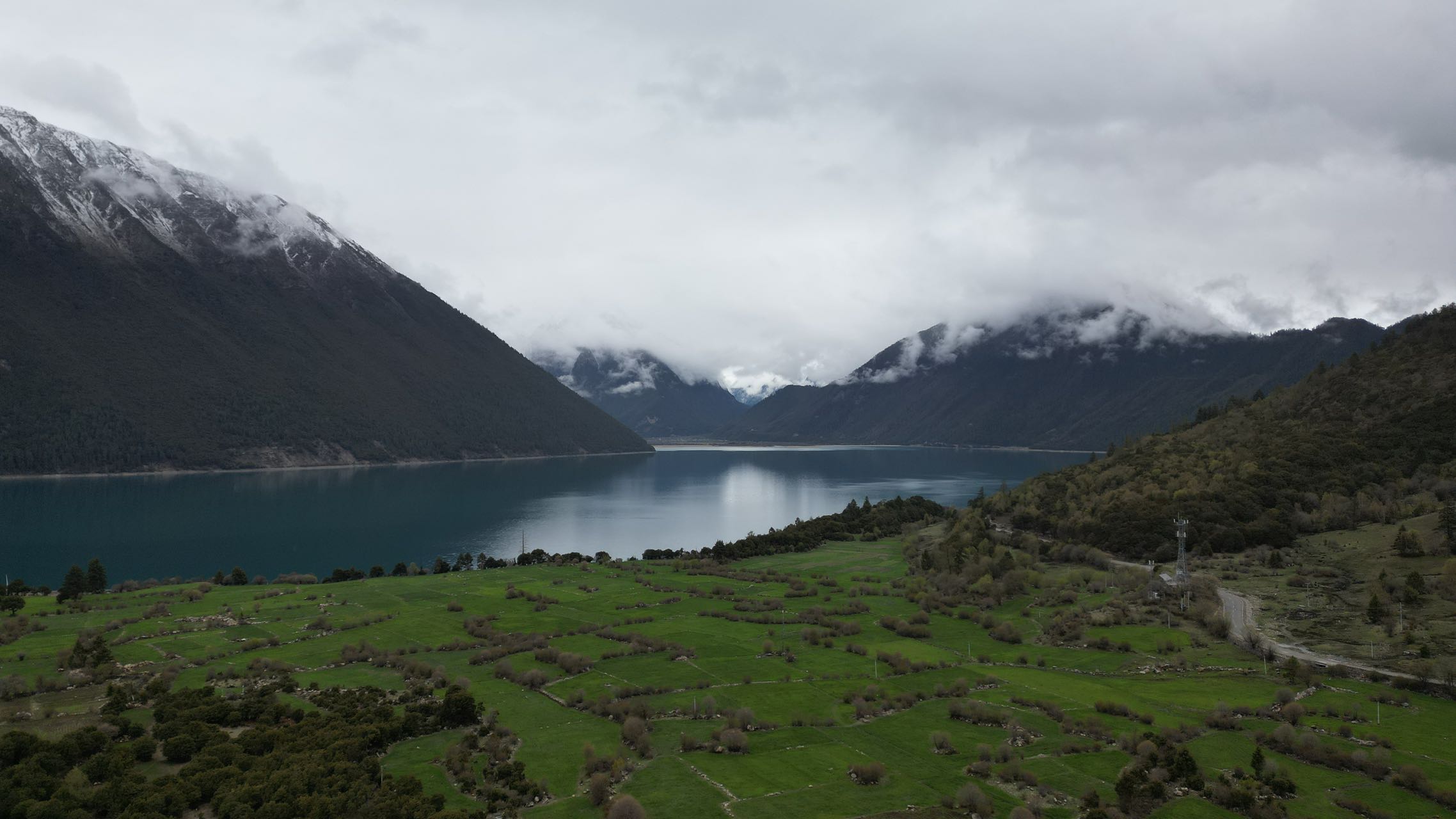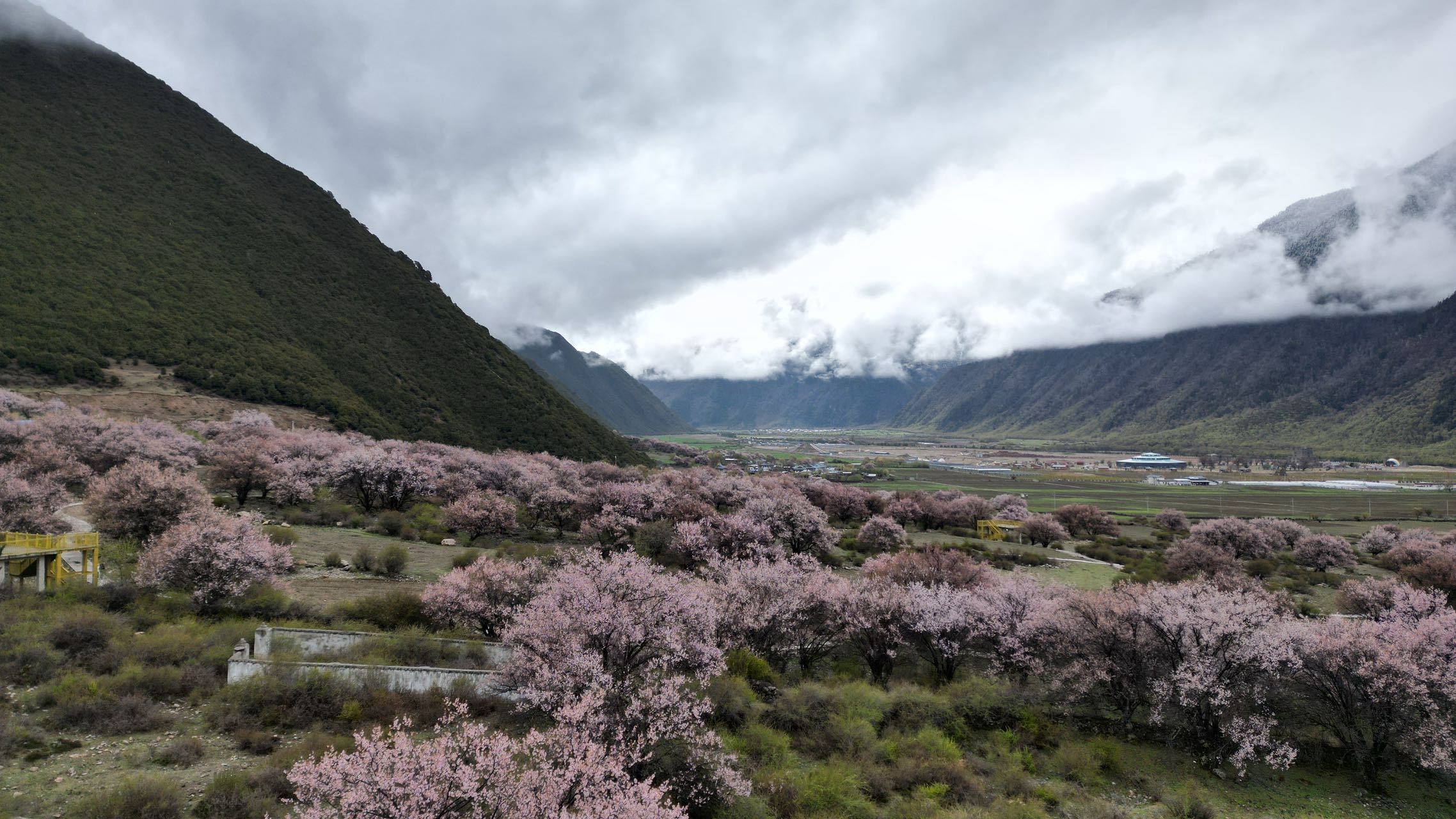 在这条开往巴松措的乡道上,我们领略到了塞外江南的风景,沿途星星点点的散落着盛开的桃花,点缀在大片的绿野里,加上云雾缭绕,真有点绿野仙踪的味道,偶尔经过的村庄,桃花掩映在里边,很是好看。经过一片桃花林,层层落落的桃花煞是好看,忍不住在细雨中飞了无人机航拍。