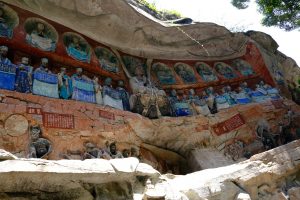 第二天,老彭特意请了一天的年假,开车带我去大足石刻。科普一下,大足石刻是我国第二个列入世界非物质遗产的地方,整个大足石刻大部分分布在大足县境内,大足石刻最初开凿于初唐永徽年间,历经晚唐、五代,盛于两宋,明清时期亦有所增刻,最终形成了一处规模庞大,集中国石刻艺术精华之大成的石刻群,堪称中国晚期石窟艺术的代表。大足石刻其规模宏大、雕刻精美、题材多样、内涵丰富、保存完整而著称于世;以集释(佛教)、道(道教)、儒(儒教)“三教”为一体。这次我们去了最主要的两个地方,一个是宝顶山,还有一个是北山。从市区到大足县境内的宝顶山,大概要一个半小时。此时,重庆天气也比较热了,气温达到了30度。我和老彭到达宝顶山的时候差不多中午,太阳直射,没一会儿就已经出汗了。下到山坳里,就是石刻分布的地方,很多石像经过修复,呈现出精美的工艺,甚至能看到神态。也有不少在WG中被破坏了,很多是被铲掉了佛头,一阵阵惋惜。