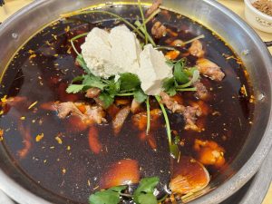 中午,老彭带我们去体验了下日常川渝老百姓常吃的兔肉。驱车到大足县城的德福街,找到369霸王兔店,几乎不要点菜,就直接一个兔子活杀,剁成块,锅里炒制一下,就下到火锅里开煮。考虑到我们两个外省的,吩咐厨房不要太辣,也不要把兔头放进去,但那个辣度,已经是让人边吃边冒汗了。新鲜兔肉,混杂着香料,吃在嘴巴里,嫩嫩的,鲜味十足。兔肉没有一丝的肥肉,因此也没有顾忌,敞开了吃,感觉这味道离开这里就很难再吃到了。