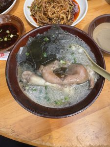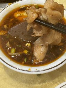 中午是司机推荐的蹄花饭,在渝北区锦橙路上,就是一碗猪爪加海带芸豆,配上一碟辣椒油,我们又配了几个凉菜(拌肠头、拌肠片等),主要是辣椒可以丰俭由人,因此这顿饭吃的也比较舒服。