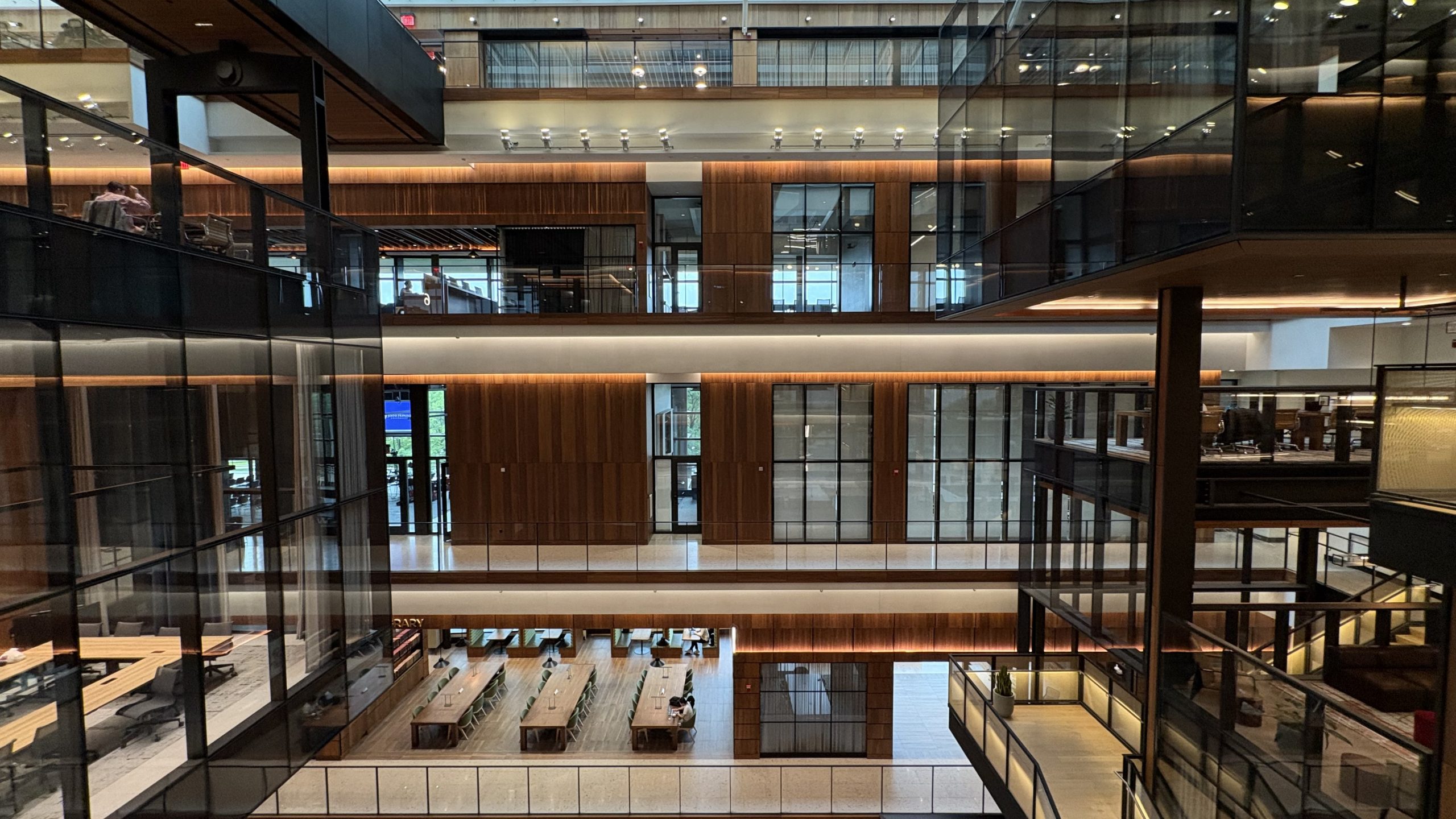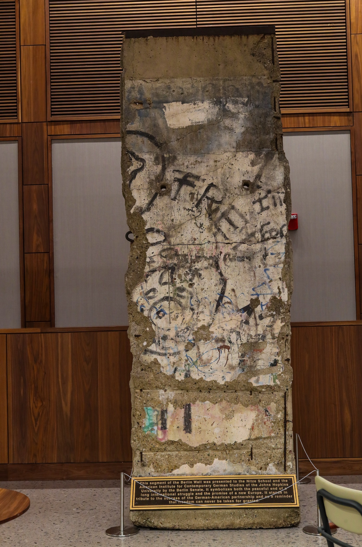 下午刘同学利用她有霍普金斯的学生卡都便利,带我们去参观了霍普金斯商学院。霍普金斯商学院是唯一在华盛顿特区的校区,在寸土寸金的地方,拥有一幢楼,而且就给了商学院,当然也装修的豪华。安检后进入先下负一楼,里面有一段柏林墙,在诉说着那段历史。学生们安静的在各处学习,或单独在自习室、或在卡座里。