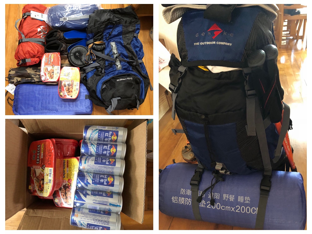打包内容:头巾、登山杖(双杖)、背包70L+、头灯、登山鞋(中帮)、太阳帽、抓绒衣、速干裤、0度睡袋、户外水杯、碗筷、四季帐篷、蛋槽2张、防潮垫铝膜1张、太阳镜、太阳能充电板、充电宝、充电线。食物的话,6包方便面,1挂面,运动饮料3瓶,肉食加若干零食罐头等
