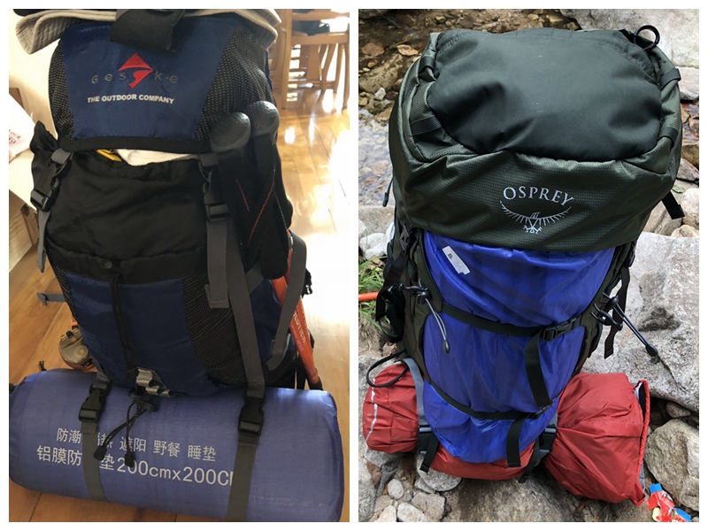从车库去找之前的户外装备,找到了碗筷、户外多功能刀、抓绒衣、速干衣裤、速干太阳帽等,可帐篷和睡袋就是不知道哪里去了,登山鞋也没有了(结果问了下,老妈说看我不穿,登山鞋送我舅舅了,几千的踢不烂重装鞋就没穿几次)。万能的京东,立马牧高笛三季、黑冰G700、SCARPA中帮GTX、Fenix头灯走起,准备好了这些东西,开始拼命往我这个10年前买的老包里塞。塞的起劲,杯具了,可怜的包包,居然塞裂开了,那个汗啊,只能想办法在最快的速度里搞定一个新的背包。然后,最快就是园区的三夫户外了。入手了Osprey 苍穹70L的背包。本来想搞个骚包的橘色的,在野外,亮色比较安全,但是黄色的话,也招虫。但是只有一个军绿的现货,算了,买吧。