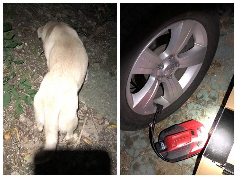 等后面管总居然和青梅他们两下来,5点过,喊车再开到我们停车的地方,车程差不多50分钟,那个乡道简直是我们这80年代的路,全是坑坑洼洼的石头路,车子开不快也颠的厉害。到停车场已经是晚上快7点半了。下车第一件事情就是检查车胎,胎压计一测,只有1个气压了。原来还抱有一点希望,直接破灭,车上常备有锂电池的充气泵,直接打气,但是电池电量不是很足,打到没电,才到1.9个气压,赶紧让管总联系附近熟悉的人,找补轮胎的地方。下山,去修轮胎,好不容易找到第一家,结果人家出去了,要后天回,再问,找了另外一家,打电话过去,说是也不在,又给了另外的修车铺电话。找过去的路上,看到中石化加油站,顺便加满油。期间打了几次电话,才找到修车铺,很快的补好了轮胎。补胎期间另外一个车去找吃饭的地方,我们修好轮胎过去正好开饭。由于轮胎补好了,心里的担忧也少了,饭店的饭菜就觉得格外好吃,可能是饿了的缘故吧,后面三个人又喝了3瓶白酒,就在这个农家乐住下了。