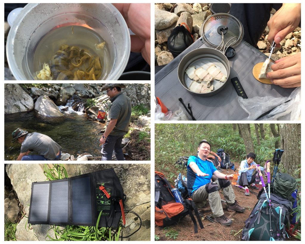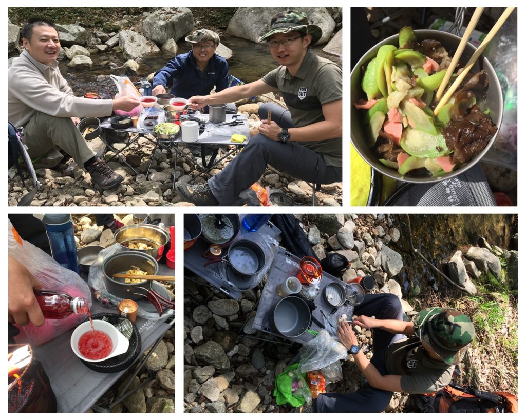 管总带了两个铝合金折叠小方桌,摊开来放置各种食品,真的很佩服他们一家,居然油盐酱醋都带了,关键还带了黑猪肉,生鸡蛋,蒜苔,小白菜等。生鸡蛋哦,我怕都碎了。直接开始在溪边用气炉做起饭来了。气炉还是土豪级别的MSR,烧水做菜好快。中午做了回锅肉,丝瓜炒木耳,本来想煎荷包蛋,结果搞砸了成了炒鸡蛋。还煮了挂面,再烧水泡茶,好不惬意。我拿出太阳能充电板开始给头灯、手机、garmin手表充电,还别说,这个太阳能充电板在太阳完全照射的情况下,充电还是比较快的。以后可以不用带充电宝了,就是garmin的飞5用来记录GPS轨迹比较耗电,满电情况下用5个小时差不多了,没有标称的时间长。