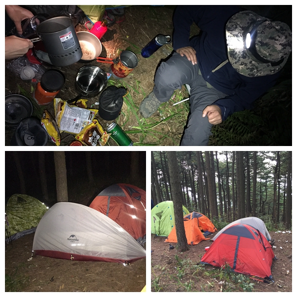 今天的路程完成了整个行程的三分之二,21公里。由于到达露营地已经是晚上快8点了,周围一片漆黑,传说中的多云寺也没看见 。总感觉在庙门前有点怪怪的。我们在头灯的照亮下搭帐篷,准备吃食。期间管总和小李去打水,取水点要下去200米,在一棵树边上,加上溪流小,等了很久他们才上来。期间还担心他们怎么了,没有声音,也没反馈。开始烧水,本来想煮点菜的,因为时间太晚了放弃,直接煮方便面吃,吃了好早点睡觉。而我为了减重,把白酒拿出来了。我、管总、小李开始就着方便面、熟食猪舌头、榨菜丝喝酒,也是别有野趣。