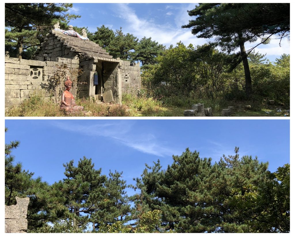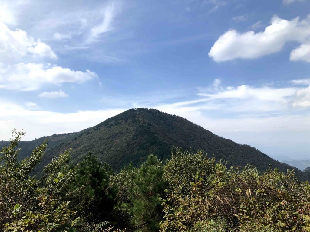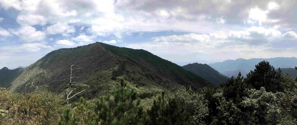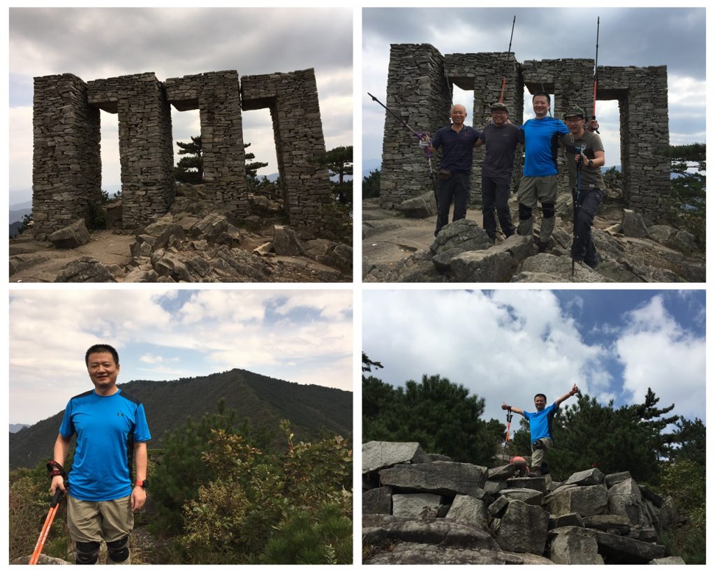 10月2日,第二天行程,今天相对第一天来说,会比较轻松点。就是冲顶1777白马尖,然后就是下山。早上在鸟鸣声中醒来,窝了一会儿,爬出帐篷,山里空气相对来说比较清新,负离子很多。我、管总、小李去打水,走了几步,发现右侧膝盖还是不行,甚至加重了,弯有点酸,主要是外侧髂胫束那个位置,考虑应该是髂胫束综合症了,半月板等应该没有问题。太阳出来了,我去多云寺看了下,一个非常小的寺庙,就三间,全部是岩石搭起来了,屋顶也是石头,当然,也是有点破败了,里边有好几块碑文,记录这个寺庙多次重修,文革破坏后,就一直没有修起来。这个上千年历史的庙也印证了历史的兴衰。早上做早饭,开始腐败起来了,先是炒鸡蛋、然后洋葱炒肉片、娃娃菜炒肉片,加上挂面,早饭吃的很饱,味道也觉得非常棒。吃饱喝足,开始拆帐篷、打包睡袋、整理背包等。这个时候由于包里的食物减重,减少了3.5公斤左右,顿时觉得背包轻松了点。忙活了一阵,已经到11点45了,一路下去,准备冲顶1777白云尖,这个1777是整个大别山山脉中最高的主峰,本来海拔1774,后来人为的在上面用石块堆砌出来了1777四个数字,成了海拔1777米。其实在路上我考虑膝盖的原因,是准备放弃冲顶的,后来经不住各种劝和诱惑,不带负重,直接冲顶。