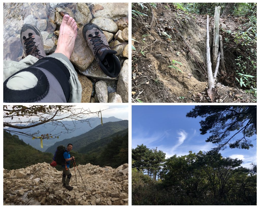 这个上鬼门关全程没有路,而且是直上直下接近九十度的爬山,加上负重近四十斤的背包,难度可想而知。可三观被领队管总的父母刷新了,年近七十的两位老人家,带着负重很快爬上去了,而我们三个菜驴,真的是手脚并用,喘着粗气加上心惊胆战,费了九牛二虎之力互相协作才上去,中间还有小惊险,上面的小落石滚落下来,还是让人有点怕的。万一掉头上,直接开瓢。这是人生第一次全程无保护的爬这么高几近垂直的山,还带负重。好不容易到了顶部,穿过一个天然窄窄的门洞,就进入了稍平缓的路段,而这一段路程开始,与景区没关系了。但山路更加难以分辩,也没有路,只有靠一段段的红布条来确定路线,穿过草丛灌木丛,来到溪边,已经是将近早上十点了,我们在这开始休息,摊开各种装备做吃食。
