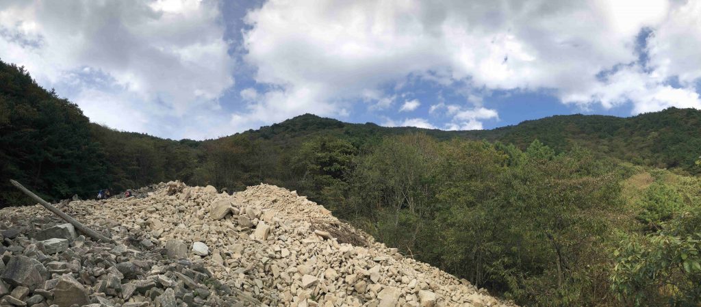 登上1777峰顶,一览众山小,同时脑子里总想着刘邓大军千里挺近大别山,我这不也是千里进大别山么,顿时豪迈了一点。在1777标记下面拍照,然后拍了周围的风景,赶着下山,心里惦记今天能不能早点到山下,毕竟还是惦记着车胎的事情,在这小的地方,而且又是节假日,别没法补胎,那麻烦也大的。下到山下冲顶开始的地方,背上背包,开始下山的路,一路上右侧膝盖外侧一阵阵的疼,每走一步路都疼,尤其带有膝盖旋转的动作更是疼的抽冷气。但是长痛不如短痛啊,反正也没有退路,只能咬牙下去。下山的路比之前的路好很多,因为现在1777是景点了,所以下山的一段山路不是像之前无人区那样的穿行灌木丛了,走的是伐木道,好很多,但是在下面一段路,由于山体滑坡,道路冲毁,感觉是在走乱石堆。
